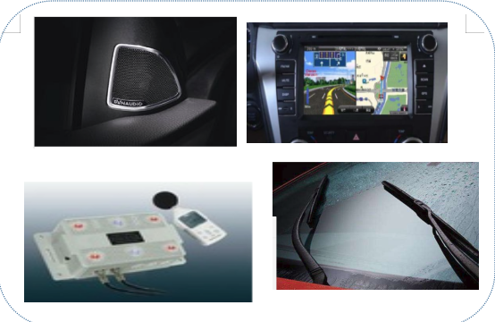 車載電視/音響,DVD/GPS,防盜器,雨刮,機動車電喇叭,洗滌器,轉向柱上組合開關,翹板開關,保險絲、各類電機、點火線圈,繼電器、車載充電器、車車載按摩/加熱坐墊、車載風扇、車載空調、車載電水壺、車載冰箱、車載咖啡壺、車載電動千斤頂、車載吸塵器、車載電動工具、信號閃光器、玻璃升 降器……