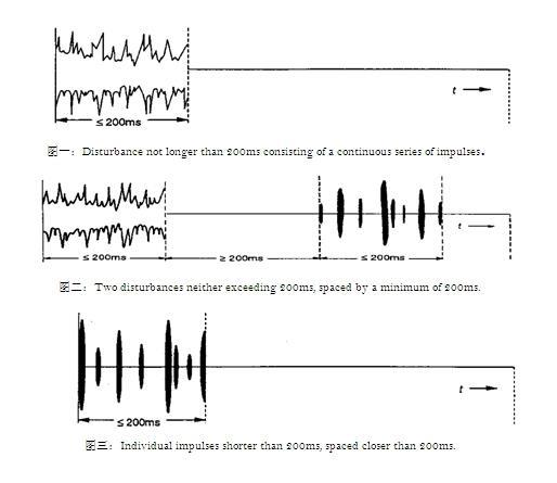 喀嚦聲 (click),一種電壓騷擾,幅度超過連續(xù)騷擾準(zhǔn)峰值限值,持續(xù)時(shí)間不大于200ms,而且后一個(gè)騷擾離前一個(gè)騷擾至少200ms,持續(xù)時(shí)間由超過測(cè)量接收機(jī)中頻參考電平的信號(hào)確定。一個(gè)喀嚦聲可能包含許多脈沖,在這種情況下,相關(guān)時(shí)間是從第一個(gè)脈沖開始到最后一個(gè)脈沖結(jié)束的時(shí)間。