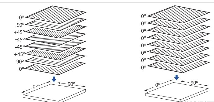 由于碳纖維復(fù)合材料屬于各向異性材料,因此材料沿纖維方向和垂直纖維方向性能存在明顯差異,以拉伸試驗(yàn)為例,復(fù)合材料0°拉伸性能和90°拉伸存在較大差異。
