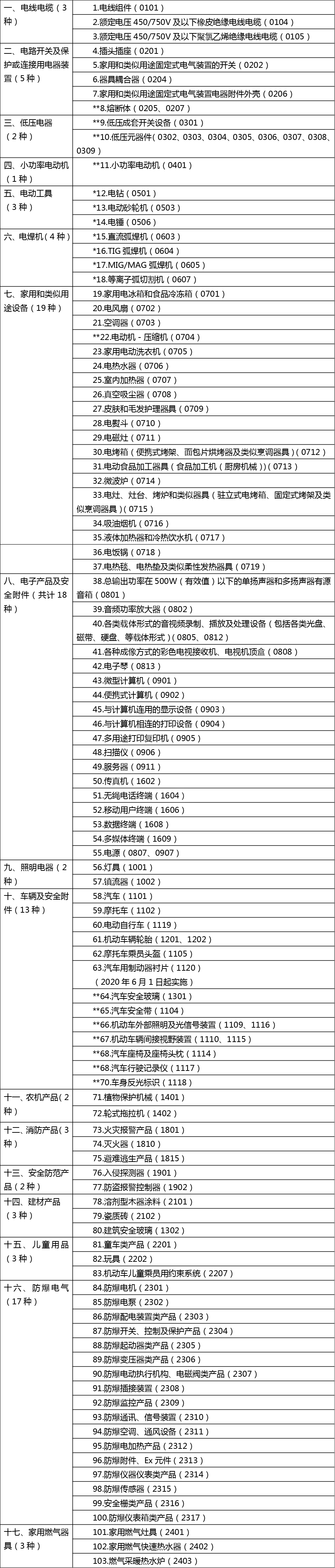 注:*所標記產品為實施自我聲明程序A(自選實驗室型式試驗+自我聲明)的產品(7種),