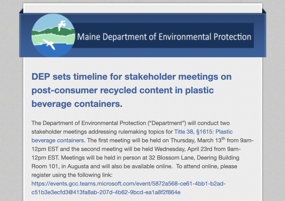 美國緬因州環境保護部將于 2025 年 4 月 23 日舉行一次利益相關者會議,就《緬因州法規第38卷第1615節》的相關內容進行討論。此前,緬因州發布了一項與回收塑料相關的法案《緬因州法規第38卷第1615節》,該法案旨在通過分階段提高塑料飲料容器中消費后回收材料(PCR)的比例,推動該州循環經濟和可持續發展。以下為該法案的主要內容。