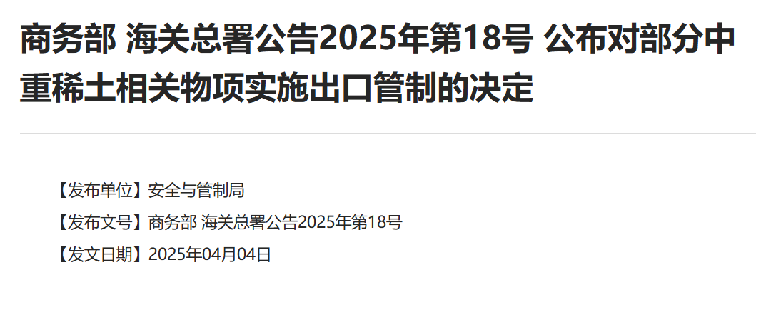 2025年4月4日商務部 海關總署公告2025年第18號 公布對部分中重稀土相關物項實施出口管制的決定。