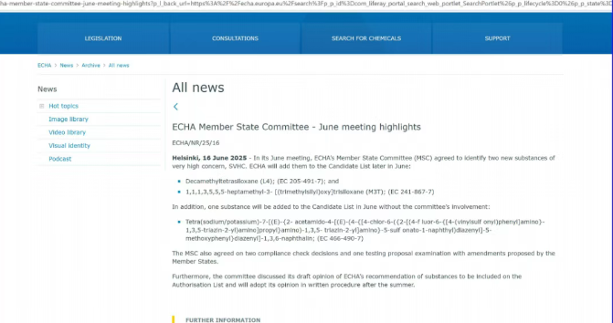 2025年06月16日,歐洲化學品管理局(ECHA)發(fā)布消息,將3種新關(guān)注物質(zhì)正式列入SVHC候選清單中。至此,SVHC清單共包含250項物質(zhì)。