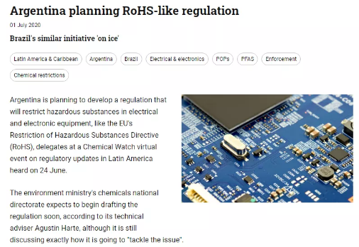2020年6月24日,阿根廷宣布正在計劃制定一項限制電子電氣設備中有害物質的法規(guī), 類似于歐盟的RoHS。根據技術專家的意見,當局近期或將開始起草此法規(guī)。
