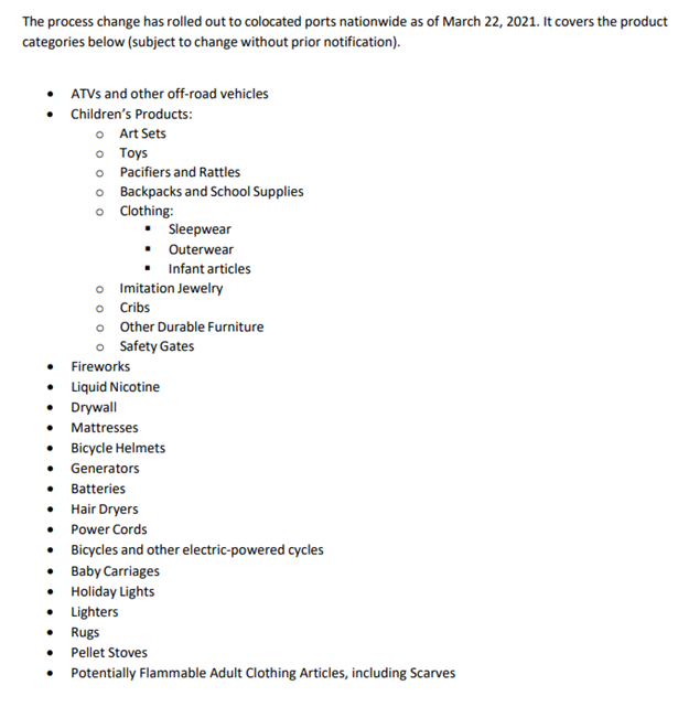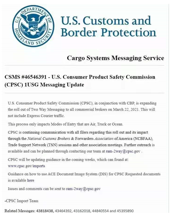 2021年3月22日,美國海關和邊境保護局(CBP)發布通知,美國CPSC升級成為參與政府機構(PGA: participating goverment agency),參與產品清關審查工作。凡是CPSC管轄范圍內的產品,不管產品是通過陸運、海運還是空運,都會被標記審查。審查包括產品的合規文件,如兒童產品CPC證書、一般產品GCC證書及對應的檢測報告等。通知還表明:進口商品即使通過了申報,如果CPSC不放行,也不能售賣,只能積壓在倉庫。