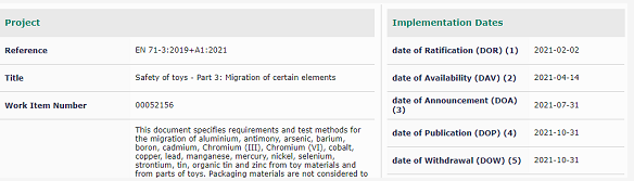 標準EN 71-3:2019+A1:2021將被賦予CEN成員國國家標準的地位,與其相沖突的國家標準將最晚在2021年10月31日被取代。該標準預計不久會得到歐盟委員會批準,在歐盟官方公報(OJEU)上發布之后,被列為玩具安全指令2009/48/EC的協調標準。目前相應的生效的協調標準仍然為EN 71-3:2019。