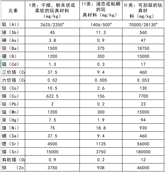 ● III類玩具材料:鋁的遷移限值從70000 mg/kg變為28130 mg/kg。