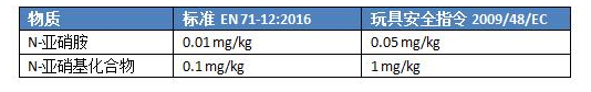 *注:標準EN 71-12:2016中第4.2條表2第a點中的限值(即針對意圖供36個月以下兒童使用,且意圖或可能放入口中的彈性體玩具的限值)低于玩具安全指令2009/48/EC附件II第III部分第8點中規(guī)定的符合的限值。