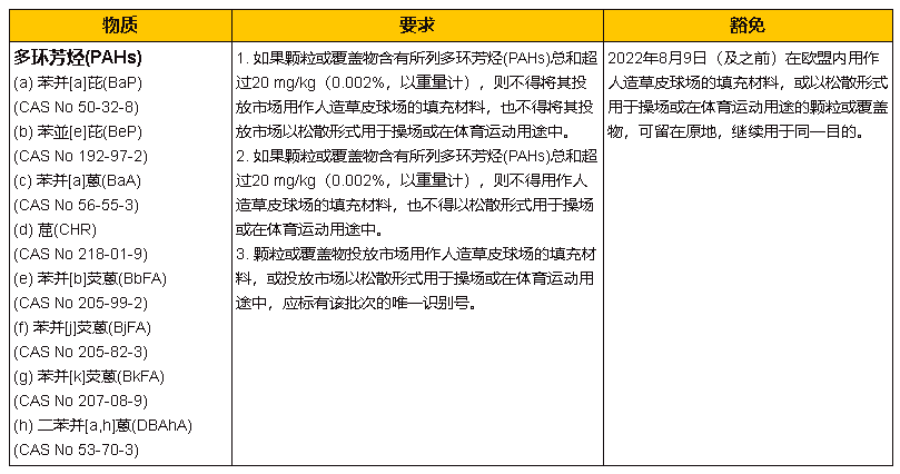 2021年7月21日,歐盟委員會發布了法規(EU) 2021/1199,修訂REACH法規(EC) No 1907/2006附錄XVII第50項,新增限制用作人造草皮球場的填充材料、以松散形式用于操場或在體育運動用途中的顆粒和覆蓋物中8種多環芳烴(PAHs)的含量。該修訂將于2021年8月10日生效,并將從2022年8月10日起實施。 以下為修訂的詳細內容: