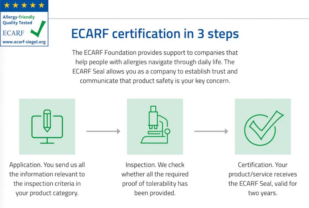 頒發的ECARF質量標志的防過敏產品,需符合嚴格的檢測標準。為了獲得認證,制造商必須披露所有的原材料和配方。